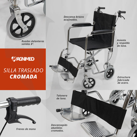 Silla de traslado cromada con frenos - ligera